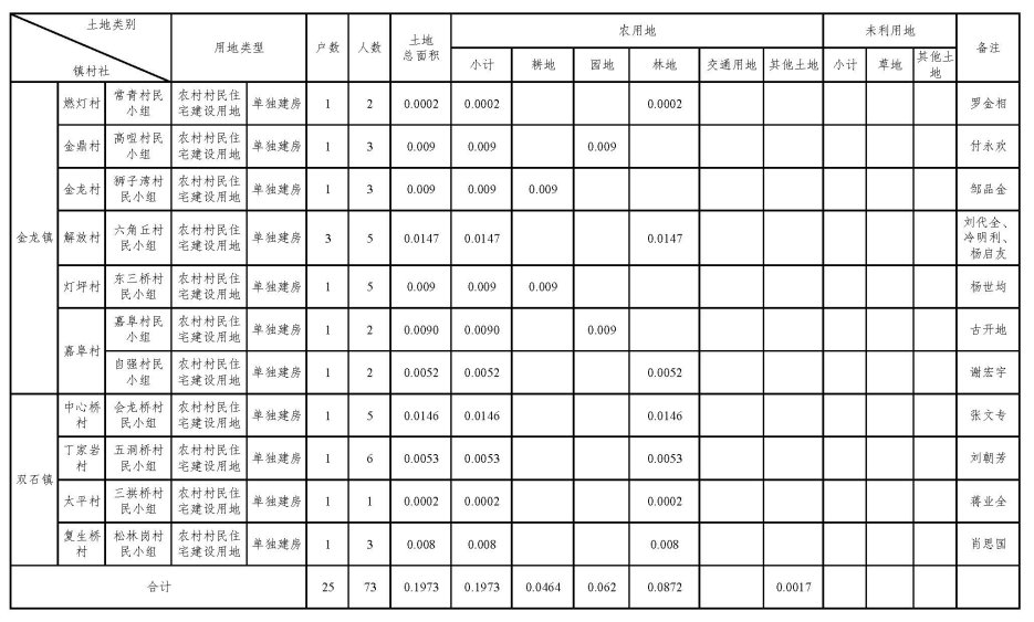 一、同意你局上报的农用地转用方案(含补充耕地方案),将朱沱镇大河村长石塔村民小组等8个镇(街道)20个村21个村民小组集体农用地0.1973公顷(耕地0.0464公顷)转为建设用地。